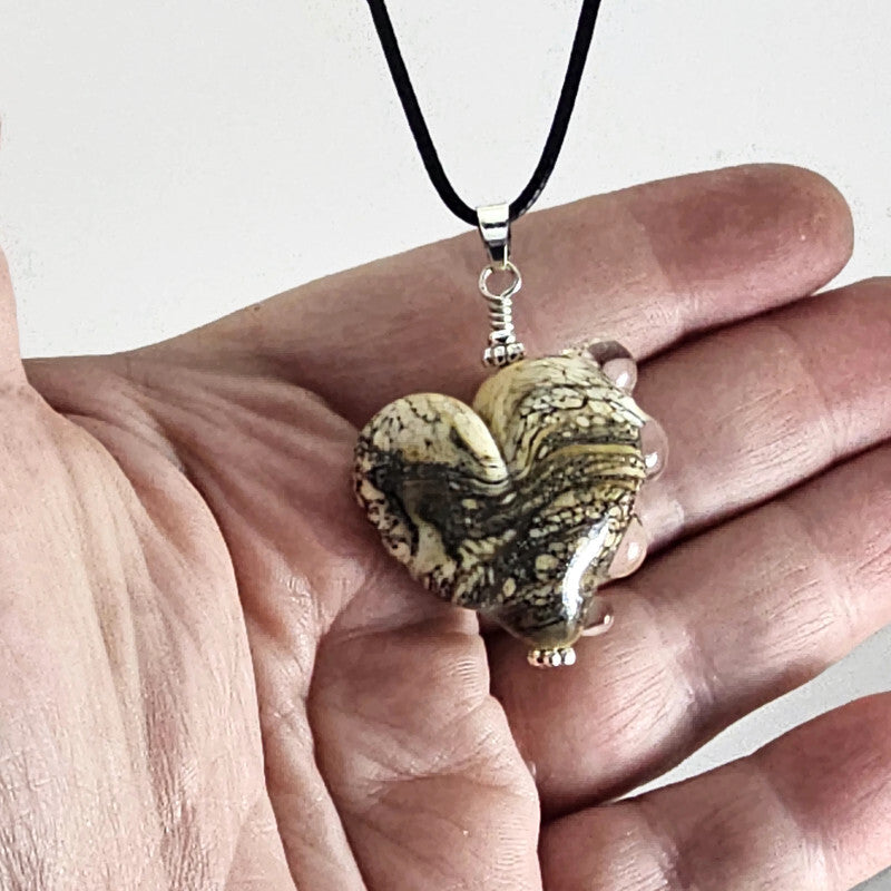 Celebrate natural beauty with this heart pendant. The flowing organic patterns combined with crystal-clear glass drops create a delicate, ethereal design that catches and reflects light beautifully. Each handcrafted piece is unique, featuring subtle variations that make it truly one-of-a-kind. A perfect symbol of love and artistry.